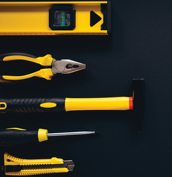 - เครื่องวัดระดับ, ไฟฉาย, คีม, ค้อน, ประแจ, ไขควง